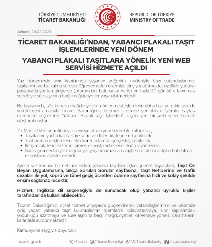 Ticaret Bakanlığı tarafından yabancı plakalı taşıtlara yönelik yeni web servisi hizmete sunulmuş olup, sözkonusu hizmete ilişkin duyuruya aşağıdaki bağlantıdan ulaşılabilmektedir.